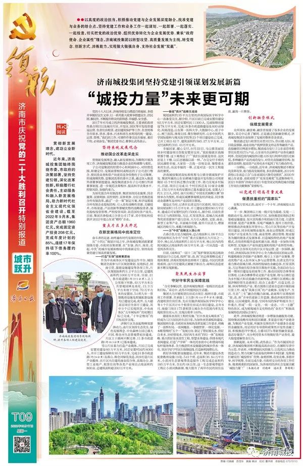 近年來,濟南城投集團始終圍繞市委、市政府的決策部署,堅持黨建引領(lǐng),深化改革創(chuàng)新,積極履行社會責(zé)任,主動服務(wù)和融入新發(fā)展格局,助力新時代社會主義現(xiàn)代化強省會建設(shè)。截至2022年9月末,集團資產(chǎn)總額1960億元,完成固定資產(chǎn)投資208億元,完成年度計劃的85%,連續(xù)17年保持項下債務(wù)履約率100%。