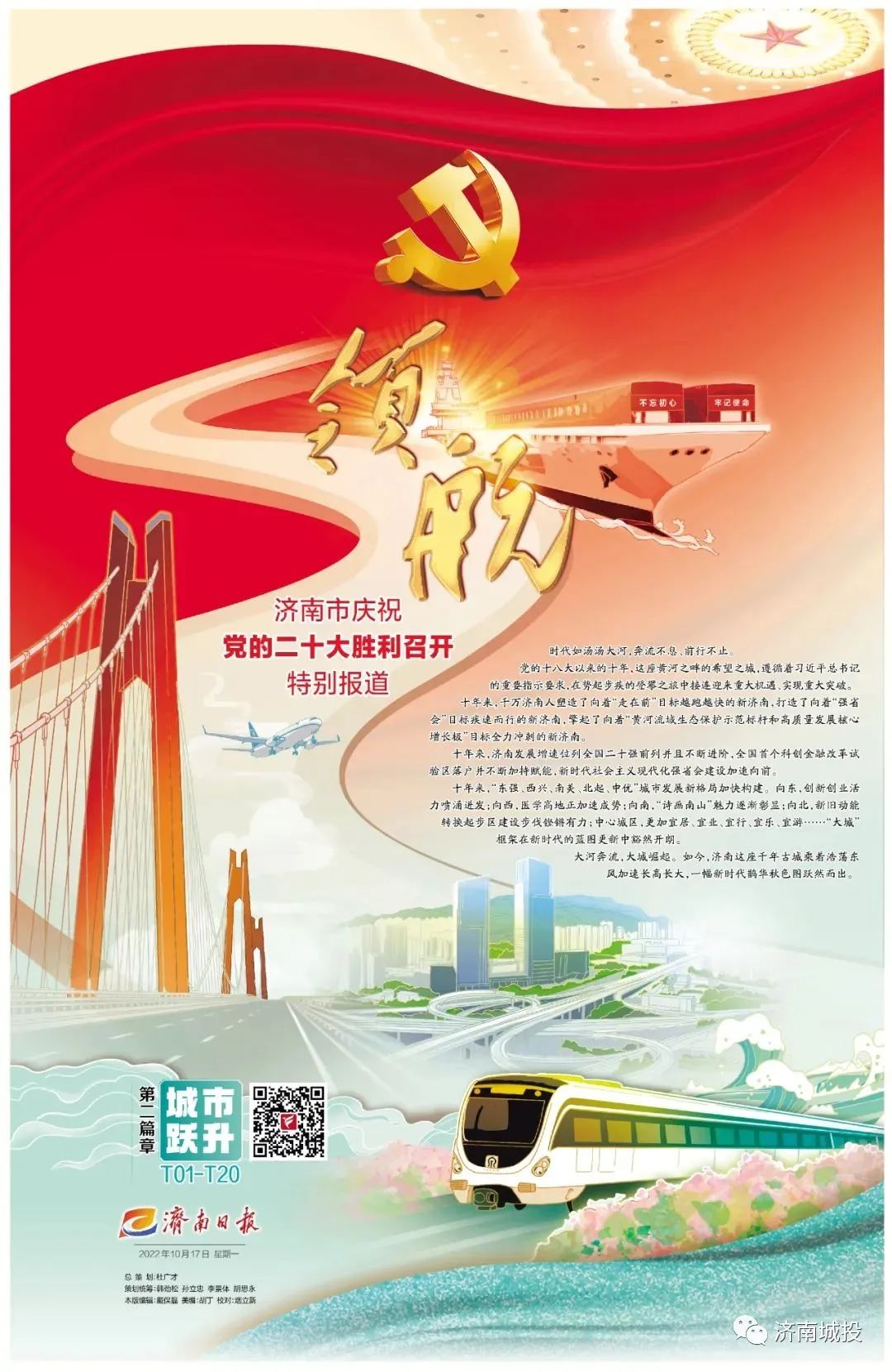 中國共產(chǎn)黨第二十次全國代表大會10月16日上午在北京人民大會堂隆重開幕。為了慶祝盛會召開,濟南日報從16日起推出《領(lǐng)航——濟南市慶祝黨的二十大勝利召開特別報道》。